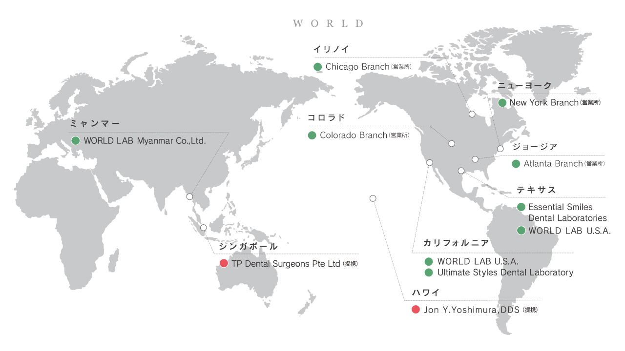 また、歯科技工の分野でも、日本、アメリカ(LA、ダラス)、ミャンマー、タイ(バンコク)に製造拠点やデザインセンターを持ち、世界各国の技工物の製造に携わらせていただいております。